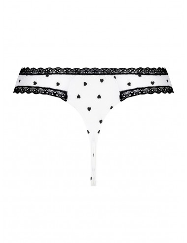 Tanga en tulle imprimé. Galon dentelle noir incrusté sur la taille et les cuisses. Nœud sur le milieu devant.
