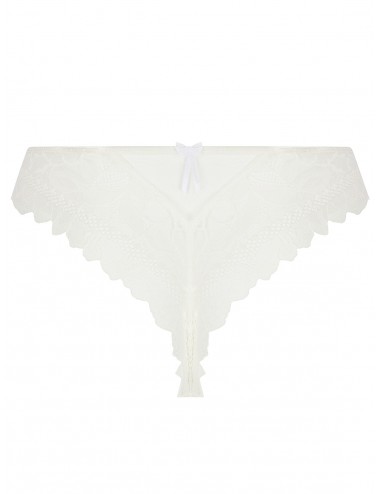 Devant réalisé avec un entre-deux brodé incrusté d'organza. Coté devant en tulle et dentelle jacquard. Devant doublé de tulle. Cuisse devant en petit galon dentelle. Dos en galon dentelle jacquard avec un triangle en tulle invisible. Nœud organza à deux pans.