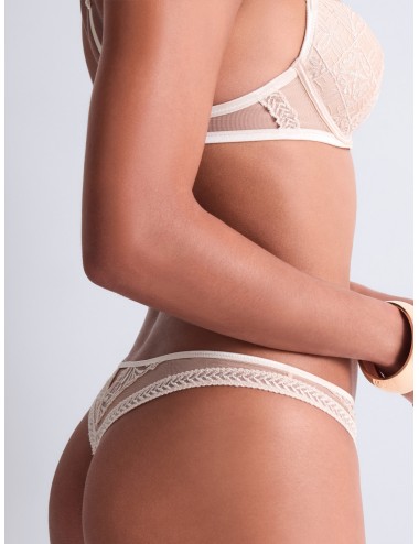 Le tanga de la collection Iconic Calypso d'Aubade, révèle la peau avec subtilité dans un sable délicatement lumineux. Sa broderie française graphique souligne les hanches avec précision tandis que le tulle apporte légèreté et modernité. Échancré à l’arrière, il allonge visuellement la jambe et assure une discrétion parfaite sous les vêtements. Une pièce sensuelle et contemporaine.