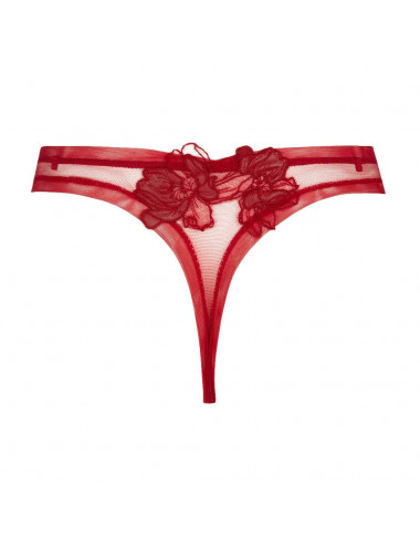 Devant en maille douce incrusté d'un empiècement côté brodé de fleurs effet cuir sur tulle transparent.Dos en tulle avec motif fleurs effet cuir incrusté.Cuisses dos et taille bordées par un tulle plié en deux.Attaches ruban à la taille pour jarretelles amovibles et bijou de corps.
