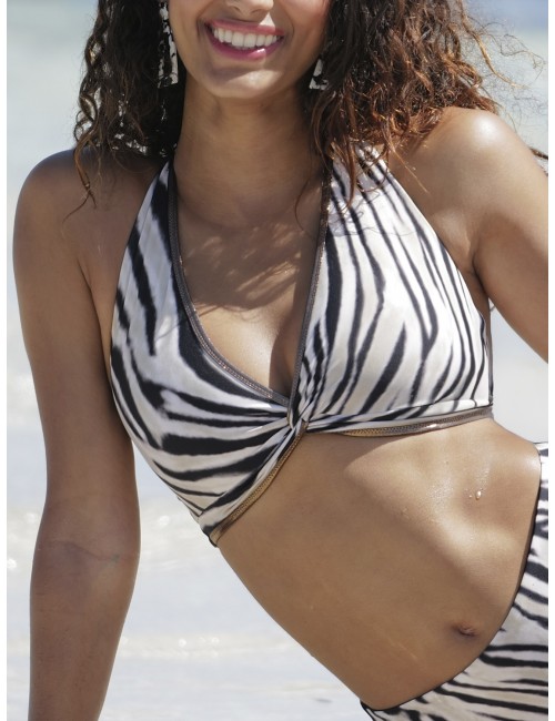 Triangle réversible, un coté en maille imprimée, l'autre en maille unie. Décolleté plongeant enrichi par des drapés enlacés à l'entregorge. Décolleté et basque soulignés par des biais en maille métallisée bronze. Noué tour de cou et au dos.